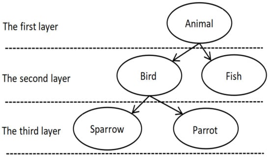 where is the closest common parent concept between and , represents the depth position of the common parent, and represent the depth position of and in WordNet dictionary, respectively. The smaller the gap between and and , the closer the kinship between common parent and and , that is, the closer and are. Figure 4 shows an example. The “Animal” in the figure is located in the first layer of the network, which is the lowest layer. According to the Wup calculation rule, both “Bird” and “Fish” are in the second layer, and the nearest common parent is the “Animal” in the first layer. Therefore, the similarity between “Bird” and “Fish” is 2⁄(2 + 2) = 0.5. The concepts “Sparrow” and “Parrot” are both in the third layer, and their common parent is the "bird" in the second level, so that the similarity between “Sparrow” and “Parrot” is . Such results are consistent with the human perception of the world, that “sparrows” and “parrots” are more similar than “Bird” and “Fish”.