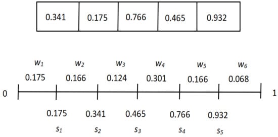 The individuals in this article are binary coded, and since three measures are aggregated in this article, each individual contains three similarity values, as well as a threshold for filtering lower similarity values, which are updated with iteration. The encoding scheme in this paper represents weights by defining segmentation points in the interval [0, 1]. Presuming p is the required amount of weights, then set of segmentation points will be obtained as = {, , …, }. An individual decoding process is to first select the elements in in ascending order to get s = {, , …, }, and then, the corresponding weights are calculated by the following formula: