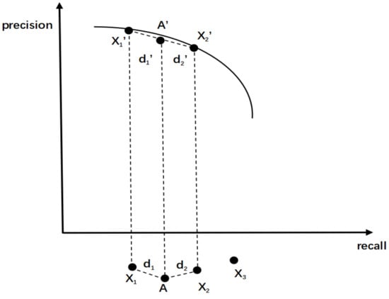 An example of evaluating a new individual A with IM is shown in Figure 8. In the figure, , and are, respectively, three INIDs closest to A, which can be used to construct IM in the form of a quadratic function, () is the distance between A and (). In the objective space, , and A, respectively, correspond to , and , and since and , which are, respectively, the distances between and , and , are very small, can be approximately regarded being on IM’s curve. Therefore, the ratio of and is approximately equal to that of and , i.e., . Finally, with this ratio and the coordinate values of and , we can determine the coordinate values of in the objective space through Equations (13) and (14), i.e., ’s recall and precision.