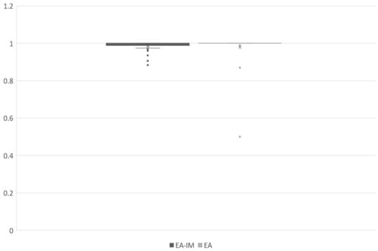 In Figure 9, the upper edge of both methods is 1.000; the lower edge of EA-IM is 0.974, while the lower edge of EA is 1.000, with a difference of 2.6% between the results of the two methods; the median of EA-IM is 1.000, while the median of EA is 1.000. Therefore, it visually illustrates that EA-IM and EA have a high degree of proximity in terms of precision. In Figure 10, the upper edge of both methods is 1.000; the lower edge of EA-IM is 0.770, while the lower edge of EA is 0.918, with a difference of 16.1% between the results of the two methods. This gap is caused by the low results of EA-IM in testing case 248, 302 and 303 because of the more complex lexical information of these ontologies. However, this does not affect the excellent performance of EA-IM in terms of the final result (f-measure); the median of EA-IM is 0.990, while the median of EA is 1.000, with a difference of 1.0%. In Figure 11, the upper edge of both methods is 1.000; the lower edge of EA-IM is 0.875, while the lower edge of EA is 0.952, with a difference of 8.1% between the results of the two methods; the median of EA-IM is 0.995, while the median of EA is 1.000, with a difference of 0.5%. The experimental results shown in these figures further show the effectiveness of IM.