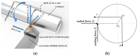 Modern manufacturing requires good quality assurance of the turned parts. One of the quality indicators is the roughness of the machined surface. To meet the requirement for minimum surface roughness a significant amount of research has already been carried out. The investigations are mostly based on experimental data obtained by measuring during turning process. Thus, experiments are done for workpieces made of various materials such as Ti-6Al-4V [1,2], dry grey cast iron [3], Inconel 718 alloy [4], stainless steel [5,6,7], for AISI 5140 [8], and AISI 316L steel for biomedical purposes [9]. The roughness properties of the turning EN19 steel, cut with the coated carbide tool [10], AISID2 turning with minimal quantity of lubrication (MQL) [11], dry turning [12] and hard turning of AISI 52100 steel [13], and Haynes 263 and Inconel 718 superalloys turning with cryogenic cooling [14] have also been considered. The obtained results show that the roughness level differs for various workpieces and turning properties and parameters. Bonifacio and Diniz [15] found that the surface roughness varies due to tool wear. Suarez et al. found the effect of high-pressure cooling on the wear patterns on IN718 alloy [16] and of the cutting forces in turning of Haynes 282 [17]. De Aguiar et al. [18] concluded that tool wear is in correlation with vibration and Bhogal et al. [19] stated that vibration has an effect on the surface roughness. Nitin Ambhore et al. [20] evaluated the surface roughness by measuring the vibration acceleration. Abouelatta and Mádl [21] studied the correlation between surface roughness and cutting vibrations in turning. Selvam [22] found that there was a correlation between the measured frequency spectra of tool vibration and also the surface profile in turning [23]. Upadhyay et al. [1] and González-Laguna, A. et al. [24] extended the conclusion by analyzing the measured vibration signals. Based on the measured results it is concluded that the vibration properties, but also the roughness of the surface and the wear in turning [25], depend on the cutting tool parameters [26] and also on cutting parameters [27] e.g., speed, depth of cut, lubrication conditions and feed rate [12]. In addition, it is seen that based on the measured vibration properties of the system the prediction of the surface roughness is possible. To reduce the surface roughness, a significant number of methods for vibration elimination have been developed [28]. Special attention is given to avoidance of chatter [29] and regenerative vibration [30]. Recently, the tendency is towards describing mathematically the surface roughness and the vibration properties of cutting. For vibration prediction, simulation models [31], numeric [32] and evolutionary algorithms [33] and also machine learning [34] have been developed. Based on the experimentally obtained results, roughness of the surface is given in the polynomial form as the function of cutting speed, cutting depth and feed ratio [35]. Thomas et al. [36] stated that the correct vibration–surface roughness relationship requires knowledge of the cutting force. In [37], the circular and axial components of the cutting force are applied for vibration calculation. Empirical formulas of the cutting force are assumed as the product of cutting depth and feed rate [38] or even cutting speed [39]. Using the linear oscillatory model excited with cutting force, the prediction of the surface roughness has been carried out [6]. Unfortunately, the results were in large discrepancy with real systems.