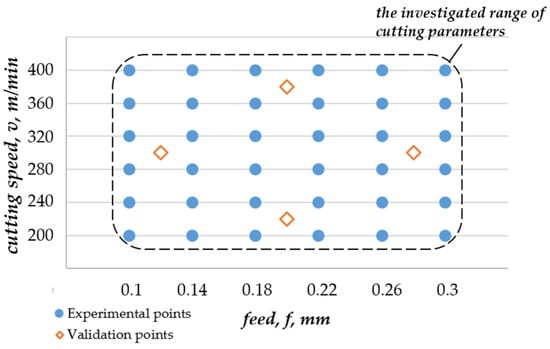 Measuring of the cutting force was done for various cutting parameters. Namely, the goal was to achieve as wide a range of machining parameters as possible, as is used in the industry. Therefore, six different feed rates and six different cutting speeds were used to cut the working piece surface (6 f 6 v) at a total of 36 measuring points (see Figure 4). The depth of cut was constant, a = 1.6 mm. In addition, four other machining experiments were performed within the investigated machining parameter range to confirm the model. The locations of the points for experimental and model verification are shown in Figure 4. The measured cutting force components are given in Table 1.