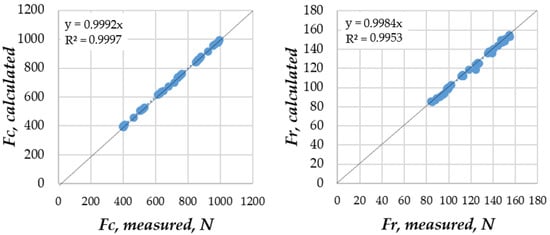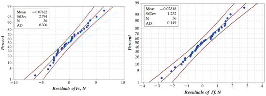 In Figure 6 the residuals in a probability plot are shown. It is visible that the mean of the residuals is practically zero. The standard deviations of the residuals are very small (2.78 N for Fc and 1.23 N for Fr), and in both components of force the residuals follow a normal distribution.