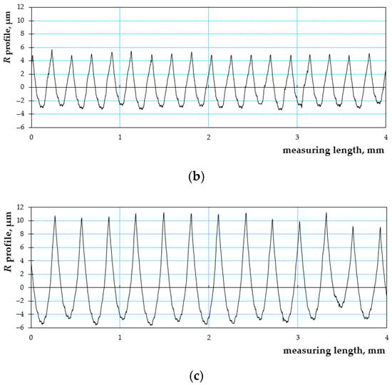 Roughness diagrams for various values of feed: (a) f = 0.18 mm, (b) f = 0.2 mm, (c) f = 0.3 mm (v = 200 m/min).