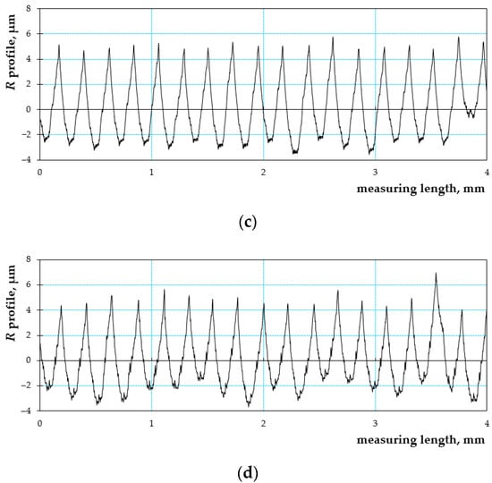 Roughness diagrams for various values of circular velocity of the working piece: (a) 200 m/min, (b) 240 m/min, (c) 280 m/min, (d) 400 m/min (f = 0.22 mm).
