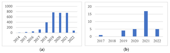 Number of articles related to cryptocurrency (a) and non-fungible tokens (b), 2014–2022 (February), Web of Science. Source: authors elaboration.