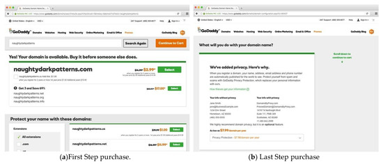 Godaddy.com sells domain names and uses a dark pattern: «Get 3 and save 69%» for USD 17.00. The next page adds privacy protection automatically to your shopping cart for USD 7.99 (Figure 1a,b).