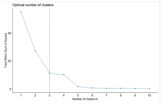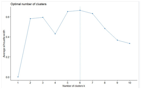 An analysis of the results obtained shows that the “silhouette” method did not cope well with the optimization problem, highlighting 6 clusters. The resulting graph (see Figure 2) erroneously suggests 6 clusters as the optimal number. We will show this later.