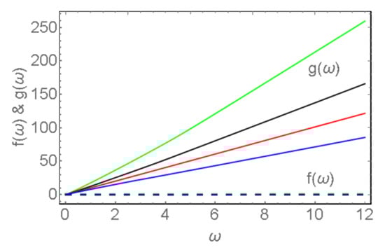 Figure 3 presents the density and velocity shape functions for four physically relevant different EoS strength parameters, , , 0, and . We integrate the ODE system between  and . As initial conditions for velocity and density,  and  have been taken. The ratio  was set to 50 here. This choice of the initial velocity (a positive value) means an initially radially expanding fluid and a physically reasonable positive density. It turned out that all four dashed velocity curves are constant and indistinguishable at this range and line widths. All four solid,  density curves have a linear dependence of . From now on, we fix , which could be the simplest choice of a dark fluid.