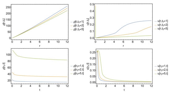 One possible application of our analytical solution is to investigate its relation to cosmological models and observations. The Hubble-law provides a velocity scaling [] for the expansion of the Universe, and numerous possible scaling mechanisms are coded in our model via the choice of the self-similar ansatz several exponents that can describe various time decay scenarios. Figure 3 presented a linear scale parameter is obtained. Although the scaling curves are linear everywhere, at around certain r values, a quick change in the velocity is provided naturally as an in-coded inflation-like behavior by the ansatz. This critical r value depends on the initial condition. As right panels of Figure 4 show high initial velocity in the dark-fluid limit,  (iii), become relaxed for a small, constant ‘non-relativistic’ value at a long timescale. Meanwhile, the dependence on the distance is getting saturated and close to flat at far distances from the initial ‘Big Bang’ point. It has been found that it is  effect for nearby objects. This precision, however, is well beyond the uncertainty of the measured Hubble-constant value [,,,]. All  curves in the lower right part of Figure 4 are getting fully flat for r ranging from 2 to 4.