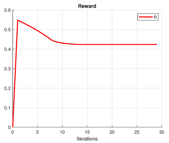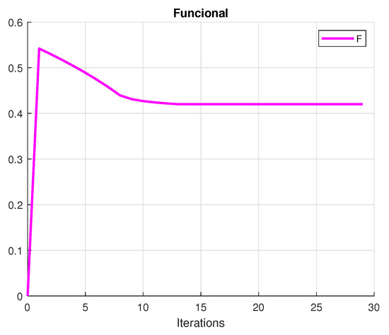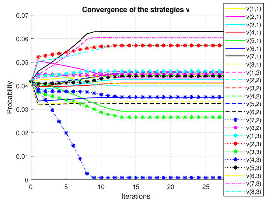 For the proposed problem, we have that the set X has eight states and the set U three controls. The initial parameters and are set to be and . For the method, the initial point portfolio is set to be in the middle of the simplex, as well as the initial distribution. The value of is set to be . As well, and .