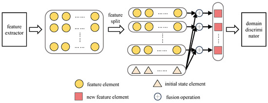 Due to the large dimensional difference between the intermediate features and the initial state, conventional feature fusion operations such as concat and add are easy to fail. We propose a strategy of splitting features first and then fusing them. Critical steps are shown in Figure 1. Firstly, the domain features (yellow in Figure 1) of the data are extracted using the feature extractor. Secondly, the domain features are split into several subfeatures with dimensions equivalent to the initial state (pink in Figure 1), and subfeatures gradually dot the product with the initial state; the dot product is given by