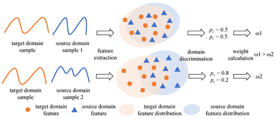 We propose to quantify transferability based on information entropy to tackle the problem of the lack of transferability quantification method, by weighting the source domain samples according to the quantification results to transfer knowledge selectively. The process of transferability quantification is shown in Figure 2. Firstly, the features of samples are extracted. Samples with high domain similarity are shown as having more domain-invariant features in the feature space, and the feature distribution of the source domain and target domain has a high degree of coincidence. Then, make the domain discrimination; the smaller the difference between the and output by the domain discriminator, the higher the similarity that the samples have, and the richer the transferable knowledge that is contained. At this time, the information entropy of the domain discrimination increases. Finally, calculate the weights; samples with higher transferability cause a greater impact on the transfer.