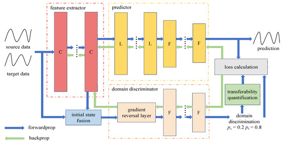 The one-dimensional convolutional neural network and Bidirectional Long Short Term Memory Networks (1DCNN-BiLSTM) has both the efficient feature extraction ability of 1DCNN and the advantages of BiLSTM in describing the dependencies of a time series [45,46]. We use 1DCNN to build a feature extractor and BiLSTM to build a predictor; the model structure is shown in Figure 3. The model consists of three basic modules, a feature extractor, predictor, and domain discriminator. In addition, the initial state fusion module (the light blue module in Figure 3) is added before the domain discriminator, and the transferability quantification module (light green module in Figure 3) is added after the domain discriminator.
