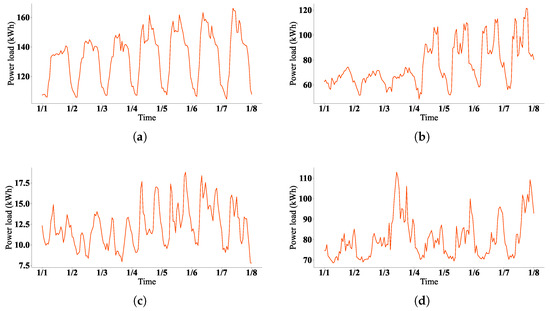Power load for the four buildings. (a) Building A; (b) building B; (c) building C; (d) building D.