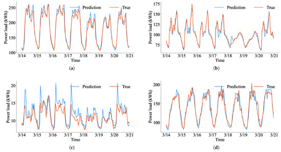 The power load forecasting curves of the proposed method for one week from 0:00 on 14 March 2016, to 0:00 on 21 March 2016, are shown in Figure 6. The fitting degree between the prediction and the true value is high. The proposed method improves the load prediction accuracy effectively. However, the prediction error of the method for local peaks and valleys in the four fields is relatively large, and the power load mutation in field C is the most frequent, which means the user’s personalized behavior is the most significant; thus, the prediction error of peaks is the largest, indicating that the prediction is easily affected by user personalized behavior. The transfer is not precise enough. Therefore, it is necessary to enhance the method’s ability to learn domain-specific features, achieve more detailed selective transfer, suppress the occurrence of negative transfer more effectively, and further improve the prediction accuracy.
