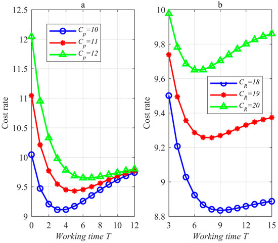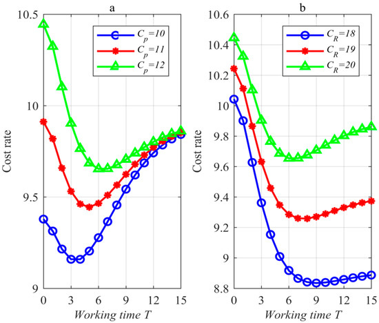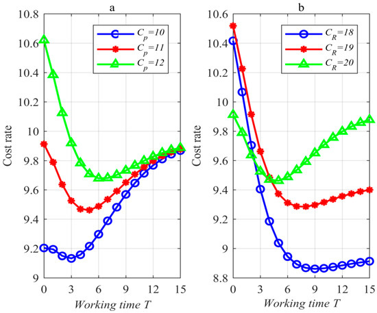 By comparing the above change laws, it is observed that a lower preventive replacement cost can reduce the optimal value of the cost rate while being unable to lengthen the system’s service period after warranty expiration; inversely, a lower corrective replacement cost can reduce the optimal value of the cost rate while lengthening the system’s service period after warranty expiration.