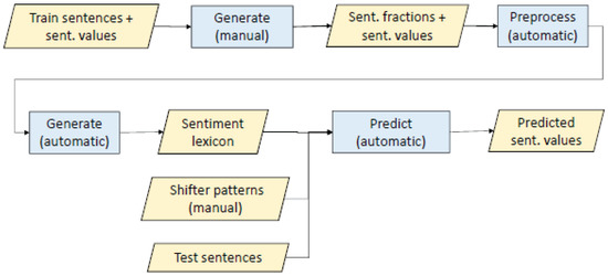 The remainder of the paper is organized as follows. The next section discusses related work. Section 3 discusses various aspects of the symbolic approach. Section 3.1 describes the automatic generation method of the sentiment lexicon. Section 3.2 is dedicated to shifter patterns and the rules that are used to derive the sentiment value of specific patterns. Section 3.3 describes how the shifter patterns are processed by the system. Section 3.4 discusses the approach that includes deep NNs—namely, mBERT. Section 4 discusses the experimental setup and the results obtained. Section 5 presents some directions for future work and our conclusions.