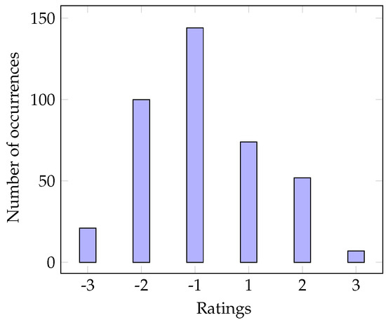 The distribution of the ratings, as shown in Figure 2, is skewed towards negative values. This probably reflects the general tendency that was observed in some studies suggesting that people tend to report on various negative aspects more frequently than on the positive ones [33].