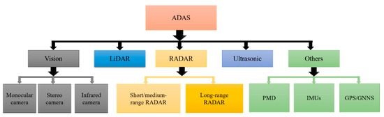Recently, autonomous vehicles have gained public interest due to their potential for enhancing road traffic productivity and capability. The advanced driver assistance system (ADAS) is the electronic system that controls driving and parking operations [32]. The automated system provided by ADAS to autonomous vehicles is a prominent characteristic for protecting the modern automobile. The safety systems are categorized into two classes of passive and active. Passive safety systems protect vehicle occupants from injuries during and after a crash, e.g., airbags, padded dashboards, and seat belts. At the same time, the active system includes various features, such as lane keeping, automatic braking, and adaptive cruise control [33]. Due to the growing client demand for smart safety systems, some of the critical purposes for manufacturers involve developing the ADAS. Moreover, with the increasing number of electronic control units and the combination of multiple sensors, there are now sufficient computing aptitudes in the car to support ADAS deployments. Various sensors enable various ADAS solutions, such as RADAR, cameras, ultrasonic sensors, and LiDAR. The vision-based ADAS, which principally manages cameras as vision sensors, is prevalent in the modern automobile [34]. Figure 2 shows the locations of various sensors in AVs. Figure 3 shows the proposed taxonomy of the ADAS based on the model of sensors used. The vision system is composed of various cameras such as monocular, stereo, and infrared cameras. The RADAR can be long-, short-, or medium-range.