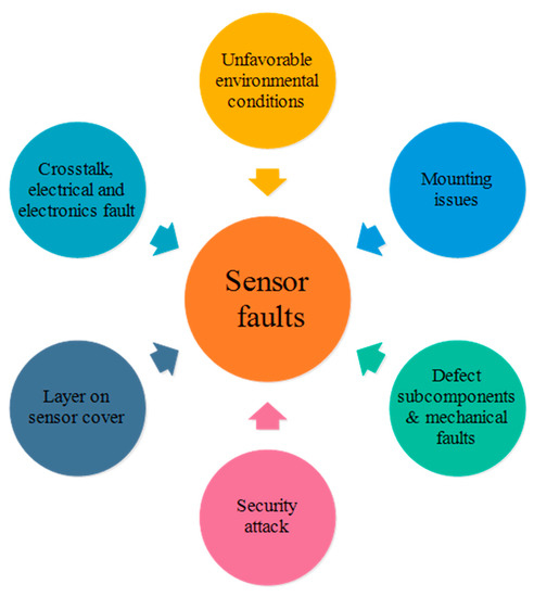 A fault is an undesirable deviation from the normal state of a system’s characteristic, property, or parameter [36,37]. The fault can be categorized into sensor, actuator, and component-level faults [38]. While the sensor fault focuses more on input module problems, the actuator faults focus on output module concerns. Furthermore, the sensor fault is categorized into hard and soft faults [39]. In hard faults, the sensor data abruptly shift from the usual situation to a faulty one; complex faults appear in stepwise format. In contrast, soft faults occur as slow degradations in the sensor output with respect to time. Soft faults are more difficult to detect and eliminate, because sensor data take time to leave a confidence limit. In addition, component or process faults occur in the complete module of the system. For the AV, the fault is usually caused because of the sensors. There are various faults in the sensors, such as a faulty transmitter or receiver, or a fault in the processing system. On the other hand, scratches, cracks, holes, and sensor covers are considered mechanical faults. A film on the sensor cover, such as water, ice, dust, snow, or salt, can prevent objects from being detected (false negatives), from being seen (false positives), or from being correctly classified [40,41]. In addition, inaccurate data injection by another active electromagnetic source leads the system to an electronic hack via a wired or wireless connection to the sensor [42]. Furthermore, when exposed to unfavorable environmental conditions, the perception sensor holds constraints that reduce the field of view. Crosstalk from other active perception sensors may cause a fault in the sensor. Figure 4 shows various faults associated with sensors [43].