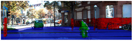 Demonstration of LiDAR application in a real environment for an autonomous vehicle (AV). The mapping of various object is identified (blue color represents the plane up to a certain extent; red color represents a static object; green color indicates a moving object) [62].