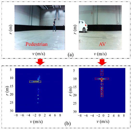 Demonstration of a particular scenario of a pedestrian and a moving autonomous vehicle (AV). (a) Digital images; (b) RADAR information of the scene using support vector machine (SVM) and multi-objective optimization [84].