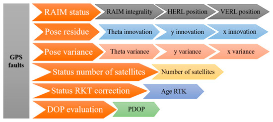 Assessing the probability of GNSS satellite fault is a well-formulated framework in the context of autonomous applications. However, autonomous vehicles operate in unpredictable conditions, which leads to additional challenges [120]. Some of the major challenges described in [121] include static infrastructure, such as buildings and thick foliage, and dynamic obstacles, such as traffic and pedestrians. Various faults, such as satellite faults and received signal faults, have been identified for the GNSS system. Satellite faults [20] occur due to anomalies in different GNSS segments, i.e., receiver malfunction in the user segment, clock anomalies in the space segment, and satellite broadcast anomalies due to the control segment. Table 8 summarizes the different fault types and techniques of the GNSS.
