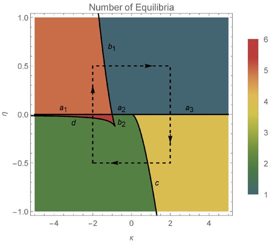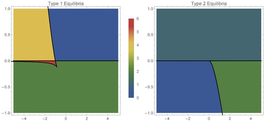 The total number of equilibria (combining type 1 and type 2) equilibria, with respect to the parameters , is represented in Figure 2.
