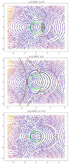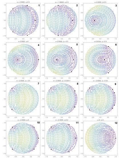 Crossing from the yellow region to the green region of Figure 2 via the curve , a saddle-center bifurcation takes place (see panel 6 in Figure 3), where the type 2 equilibria (a saddle and a center) collide and disappear. When belong to the green region of Figure 2 (see panel 7 in Figure 3), only one pair of type 1 equilibria exists (a source and a sink). In this case, the region of attraction of the sink is the whole unit disk with the unstable equilibrium point (source) removed.