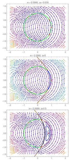 Phase portraits of system (7) and (8) inside and outside of the unit circle (the green curve) and outside it, for . Several homoclinic and heteroclinic orbits are presented (the black, blue, brown and pink curves). A detailed description is given in Section 5.2.
