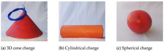 Later, filmmaking equipment (Phantom v2512) was installed some thirty meters distant to the explosive charge. The set up was established with parameters such as an area field of view of 400 m, a resolution of 512 × 512 pixels, 4 K video recording at 75,000 fps, an interval of 13.32 and 32.41 mm of focal length. The explosive charge was detonated and subsequently recorded. Finally, digital images of each trial were processed. Due to the large amount of data generated, images were processed with specialized commercial software at two stages. Initially, images were processed using the Phantom Camera Control (PCC) commercial software, and then, the Phantom System Developer Kit (SDK) was used to create an interface between PCC and Matlab software. Finally, a code based on the artificial vision technique was developed to customize, track, analyze the movement as well as present the results of the output variable. The explosive used was a pentolite 50/50 (), which is a mixture of 50% pentaerythritol tetranitrate (PETN) and 50% trinitrotoluene (TNT) [35]. The charges used were spherical by validation of a mathematical model and cylindrical and 3D cone-shaped charges by characterization of the shock wave, as seen in Figure 2.