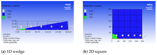 A set of six 1D simulations were extended with different mesh sizes of 2, 1, 0.5, 0.25, 0.1 and 0.067 mm to reach a high confidence level. The computational domain was based on a 1D wedge using a radial symmetric model (Figure 3a). The explosive charge was the spherical type. It had a radius of 33.57 mm, which is equivalent to 225 g of TNT. Flow properties were measured through the set of gauges, which were placed every 40 mm. Next, a set of six 2D simulations were performed. Subsequently, a comparison set of incident peak pressure histories between 1D and 2D model was extended to define a 2D numerical model with high convergence and optimal mesh size. The air domain used was a square of mm (Figure 3b). All the other parameters were equivalent to the previous analysis.