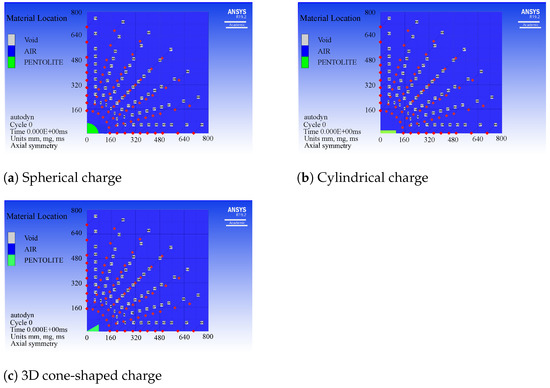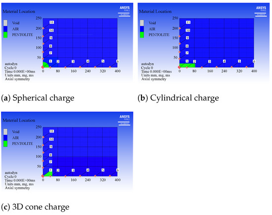 Later, a set of three 2D simulations were performed with pentolite 50/50 charges of 450 g. The computational domain was based on a 2D square using an axially symmetric model and with a mesh size of 0.1 mm. The explosive charges were the spherical, cylindrical, and 3D cone types. Figure 4 illustrates the dimensions for each shape. Flow properties were measured through a set of gauges, which were placed every 120 mm at the abscissa and ordinate.