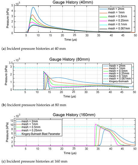 The study compared incident pressure histories between 1D and 2D analysis (Figure 8). As per the criterion of superposition of curves drawn, the 2D model appears to be accurate. Thus, the mesh size for 2D model is 0.1 mm for distances lower than 40 mm and 1 mm for distances higher than 40 mm.