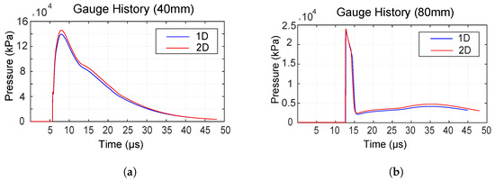 Convergence analysis between 1D and 2D. (a) Incident pressure histories at 40 mm [44], (b) Incident pressure histories at 80 mm.