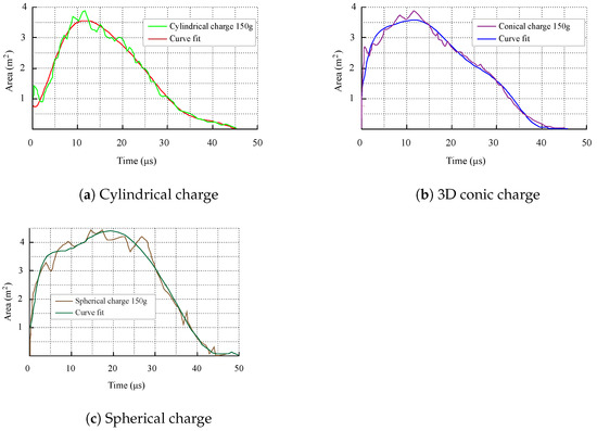 Figure 9 depicts the results of image processing in terms of change of light area and exposition time. They illustrate that the exposition time is the fastest for 3D conic-shaped charges and slowest for spherical charges, while the area of combustion behind the shock wave reaches higher values for spherical charges and lower values for 3D conic-shaped charges. Therefore, the geometrical propagation of combustion behind the shock wave may be directly related to the shock wave propagation, as indicated in the numerical results.