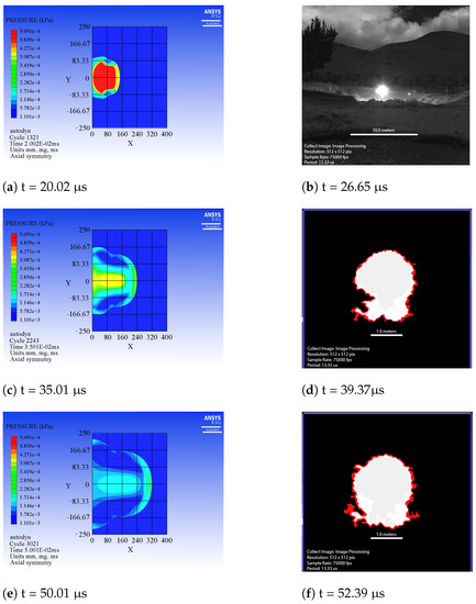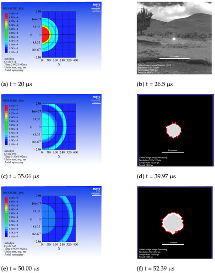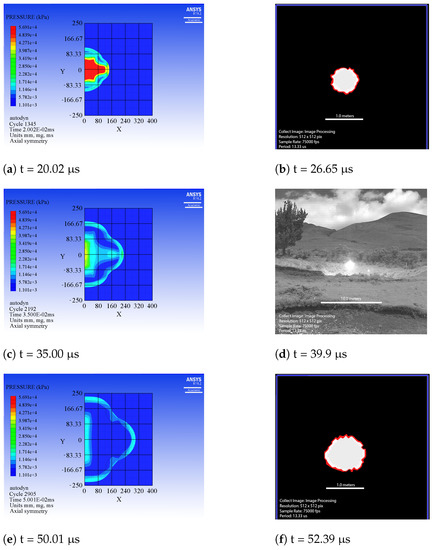 Numerical calculations yielded that the shock wave non-uniformly expands through the surrounding air. The shock wave first adopts a vertical ellipse contour until 20 s (Figure 12). After this time, it adopts a symmetric jellyfish dome-type profile. Other essential findings include that the incident peak pressure in the axial direction is greater than in the radial direction, while both axes present secondary shocks. Furthermore, the shadowgraphs (Figure 12b,d,f) must rotate 90 degrees clockwise to allow a comparison.
