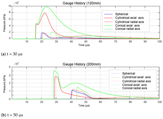 Numerical calculations yielded that the shock wave non-uniformly expands through the surrounding air. Such a shock wave adopts two well defined forms, an oblate spheroid, which is formed at the rear, and a bullet, which is formed at the front. Within the given experimental results, the schlieren and shadowgraph images indicate that the shock wave expands as a shadow ball until 26.65 s. After this time, it tends to adopt an elliptical shape (Figure 11). Similarly, the incident peak pressure in the axial direction () is greater than in the radial direction (), while the release energy is more concentrated in the axial direction. Additionally, we have realized that the shock wave travels faster in the axial direction and that the history at 200 mm demonstrates the presence of a secondary shock in the radial direction at approximately 50 s (Figure 13).