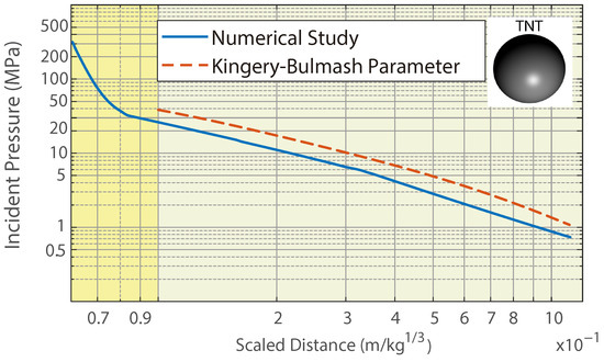 The present study allowed us to realize that there is a superposition of the curve depicted in the Kingery–Bulmash blast parameters and the results obtained from the numerical simulation (Figure 14). This indicates that both curves keep the same tendency of the incident pressure as a function of the scaled distance. However, the Kingery-Bulmash blast parameters are more conservative with an increase by a factor of 1.67, as also indicated by previous studies where a factor of 1.65 was obtained [43]. This demonstrates that this study’s computational model provides an acceptable confidence, and subsequently, it can be applied to other shaped charges.
