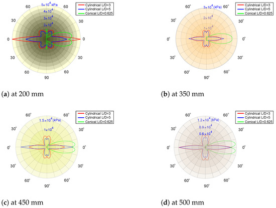 The propagation of a blast shock wave for a cylindrical-shaped charge with an and and a 3D conic-shaped charge with an is illustrated (Figure 15). Hereby, the incident peak pressure at the axial axis reaches the highest magnitudes for cylindrical charges with and the lowest for cylindrical charges with (Figure 15a). The incident peak pressure at the axial axis reaches the highest magnitude for 3D conic charges and the lowest for cylindrical charges with (Figure 15b,c). The for cylindrical charges has no effect for distances over 500 mm at the axial axis. The incident peak pressure at the radial axis at all distances is higher for cylindrical charges with and lower for 3D conic charges. Additionally, results indicate that the incident peak pressure at the axial axis is concentrated at 0 to 5 degrees for cylindrical charges and at 0 to 15 degrees for 3D conic charges.