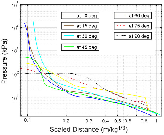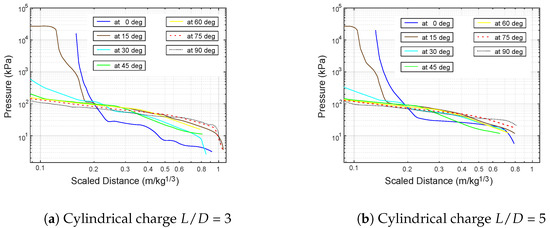 With the characterization of a blast wave for pentolite for cylindrical and 3D conic-shaped charges, the current study demonstrates the change of incident peak pressure on cylindrical-shaped charges as a function of angle orientation and scaled distance for cylinder ratios of and 5 (Figure 16a,b) and for a 3D conic ratio of (Figure 17). Results for cylindrical-shaped charges yielded that the incident peak pressure reaches its highest magnitude at 0 degrees for both ratios. However, the principal limitation is that the incident peak pressure could not be obtained for a scale distance of less than for and for . This limitation is related to the inaccuracy of incident peak pressure at that range. The effect of over incident peak pressure can only be observed at 0 and 15 degrees, whereas the incident peak pressure at 45, 60, 75 and 90 degrees has its own tendency against the scaled distance, while the angle orientation does not have much influence on the incident peak pressure. Regarding 3D conic shaped charges, the incident peak pressure reaches its highest magnitude at 30 degrees. However, the incident peak pressure for 0, 15 and 30 degrees could not be obtained for a scale distance of less than . Lastly, the effect of 3D conic geometry over incident peak pressure can only be observed at 0, 15 and 30 degrees.