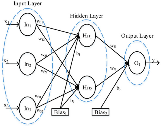 FNNs are neural networks that have forward data flow. They are frequently used in classification and regression problems. Neurons are represented as processing units for FNNs. In the structure of each neuron, there are activation functions that may be radial, linear, sigmoid, etc. Neurons generate output data based on input data using activation functions. In FNNs, neurons in each layer are fed only by the neurons of the previous layer. Neurons are arranged in layers and the outputs of neurons in one layer are input to the next layer over weights. The input layer transmits the information it receives from the external environment to the neurons in the next layer without making any changes [36]. The first layer is the input, the last layer is the output and the layers between these two are called hidden layers. Figure 1 presents the basic structure of a three-layer FNN. The number of neurons in the input and output layer varies depending on the nature of the problem. The number of hidden layers and the number of neurons in the hidden layers are chosen according to the complexity of the problem being studied [13]. The overall goal of network training is to minimize the difference between the target output and the achieved output. The FNN training process is completed by updating the weights in its structure and the bias parameters used to balance these weights in each cycle.