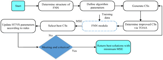 After the fitness function and coding strategy are determined, a mesh structure suitable for the data set is determined. The steps of the FNNHTVS algorithm are followed in order to find the best values of the weights and biases. A flowchart diagram of the FNNHTVS algorithm is shown in Figure 3.