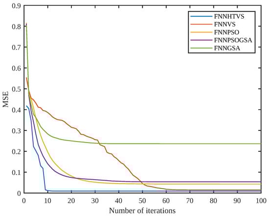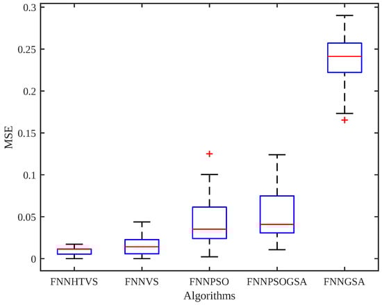 Based on the formula presented in [26,31], was used. is the input number. For the fault classification problem, an 4-9-4 FNN structure is used. This structure has a total of 85 parameters, 72 weights and 13 biases, and the parameter range is taken as [−50, 50]. The maximum iteration number was equal to 100 for all algorithms, which were evaluated based on the mean, standard deviation and best and worst MSE and accuracy values. The statistical results obtained after 30 independent runs are shown in Table 9. When Table 9 is examined, it can be observed that the FNNHTVS algorithm had a lower mean MSE and higher mean classification accuracy, compared to the other methods. A box plot graph is shown in Figure 5 and a convergence curve is depicted in Figure 6. It can be observed that the FNNHTVS algorithm had a low standard deviation and reached a lower mean MSE value in fewer iterations. The convergence curve was obtained by taking the average of 30 different runs. The FNNHTVS algorithm was compared with the methods of SVM, KNN, FNN with LM and NB. When the results shown in Table 10 are examined, it can be seen that the proposed algorithm exhibited a very competitive structure in relation to the other classifiers.