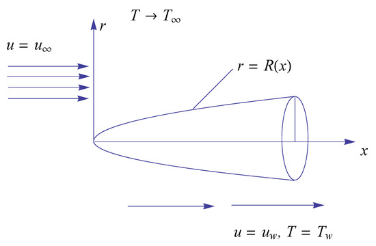 Suppose that fluid motion occurs over a thin needle moving with the uniform velocity . It is further assumed that the external flow has a horizontal velocity . The needle is deemed as a slender surface with a thickness much smaller than the boundary layer developed around it (see Figure 1). In view of the axial symmetry, it seems natural to adopt an axisymmetric cylindrical coordinate system. The flow is considered to be steady, incompressible and laminar, with and representing velocity components in the axial and radial directions, respectively. The surface of the needle is kept at constant temperature , while shows the ambient temperature such that . The present analysis will mainly focus on an exponential temperature dependent viscosity model. Results corresponding to the cases of inversely linear temperature dependent viscosity and constant viscosity will also be obtained for comparison purposes. Let us begin with presenting relevant equations that govern steady-state flow and heat transfer over a thin needle (or slender surface) (see [26] for details):