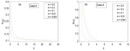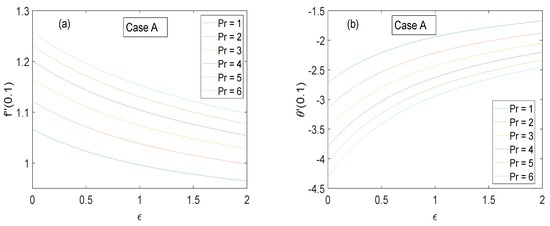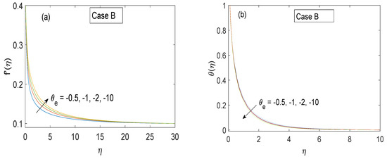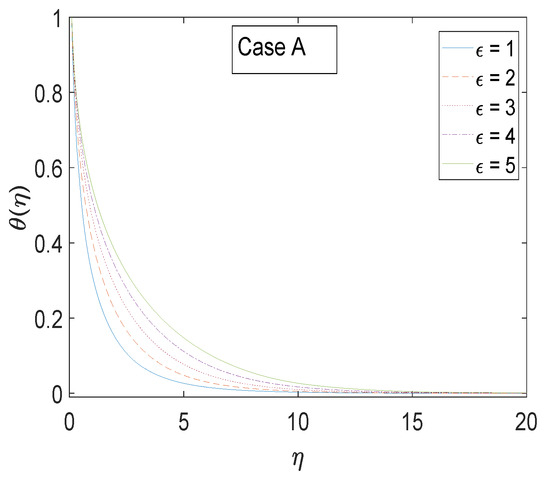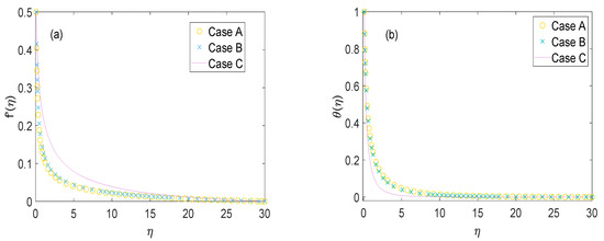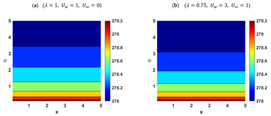 Figure 7a,b is related with the case of inversely linear temperature dependency. In these figures, the consequences of changing the variable viscosity parameter are observed. As suggested by Andersson and Aarseth [18] and Pop et al. [16], negative values of are considered for liquids. Note that an increase in can be interpreted as a decrement in . It implies that viscosity enhances whenever becomes smaller, since . Therefore, momentum diffusion strengthens as becomes large or becomes smaller. This effect is reflected from Figure 7a. The results of Figure 7a also suggest that the heat convection term is intensified because of enhancing . This ultimately weakens the heat conduction term and, therefore, a slight decrease in thermal diffusion is apparent from Figure 7b.