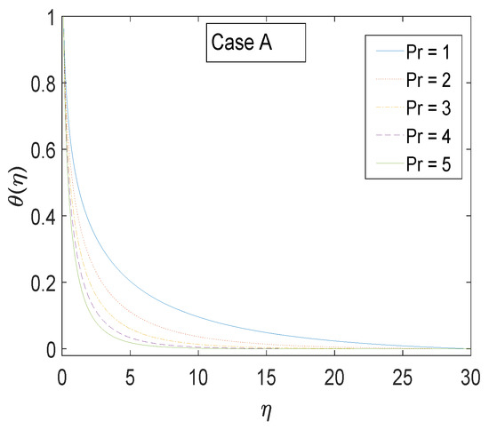 In Figure 5 and Figure 6, curves of are plotted for varying choices of parameters and . Note that corresponds to the situation where thermal conductivity has a direct relationship with temperature. Thermal conductivity grows for increasing values of , which in turn enhances temperature profile. Furthermore, as the Prandlt number rises, the relative importance of heat conduction reduces due to which a reduction in is apparent.