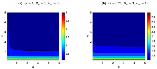In Figure 9a,b, graphical representations of and are included against at different -values. The results, obtained in the exponential temperature dependency case, reveal a decreasing relation between skin friction coefficient and for all values of , whereas an opposite trend is depicted for the effect of on In Table 1, the exponential temperature-dependent viscosity model is used to generate the data of and l at different parameter values. Shear stress at the needle surface is lowered for increasing in the range . However, the opposite result is found in the range . The last column of Table 2 predicts a slight enhancement in heat transfer rate whenever higher needle velocity is considered. Interestingly, consideration of variable thermal conductivity is seen to reduce the drag experienced by the surface. Figure 10 and Figure 11 display velocity contours and streamlines at some selected parameter values. A clear reduction in boundary layer thickness is apparent when parameter changes from to . In addition, the thermal penetration depth is also suppressed for rising values of (see Figure 12).