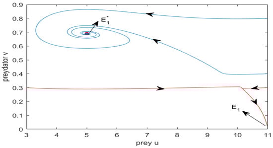 According to Equations (24) and (28), we can obtain that the critical value . Thus, according to Theorem 5, is locally asymptotically stable (Figure 4) when and is unstable when .